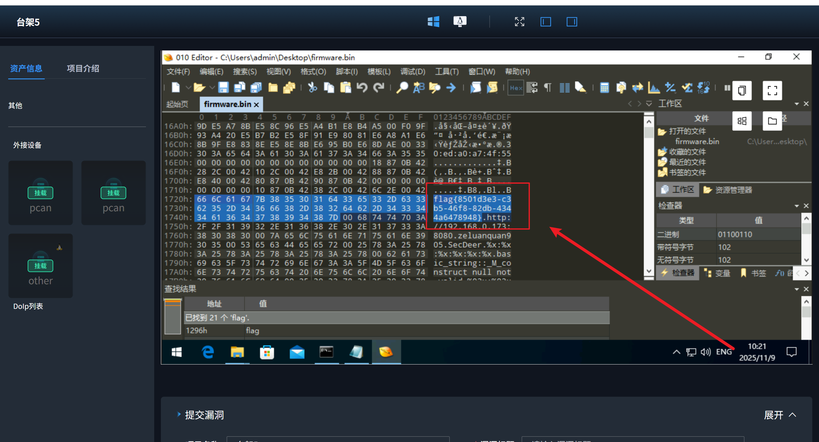 在data/local/tmp下面有个固件包,adb pull下来之后直接放010里,搜索flag即可