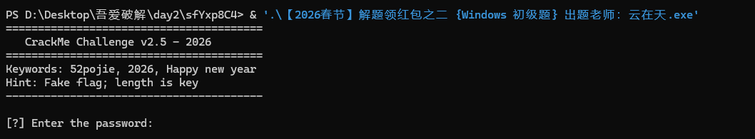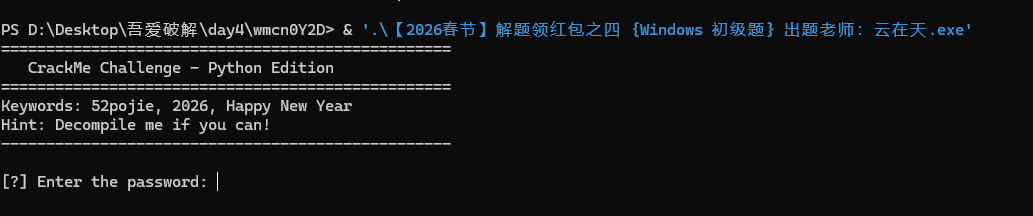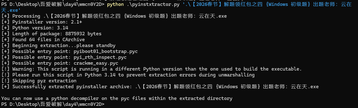 1 python pyinstxtractor.py "【2026 春节】解题领红包之四 {Windows 初级题} 出题老师:云在天.exe"