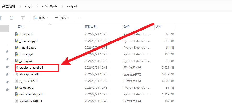 二、初始分析 程序运行时输出提示信息,要求输入密码。通过观察文件结构或运行时的字符串,可以发现该程序是使用 Nuitka 打包的 Python 程序。核心逻辑通常位于主 DLL 文件中,在本例中为 crackme_hard.dll。