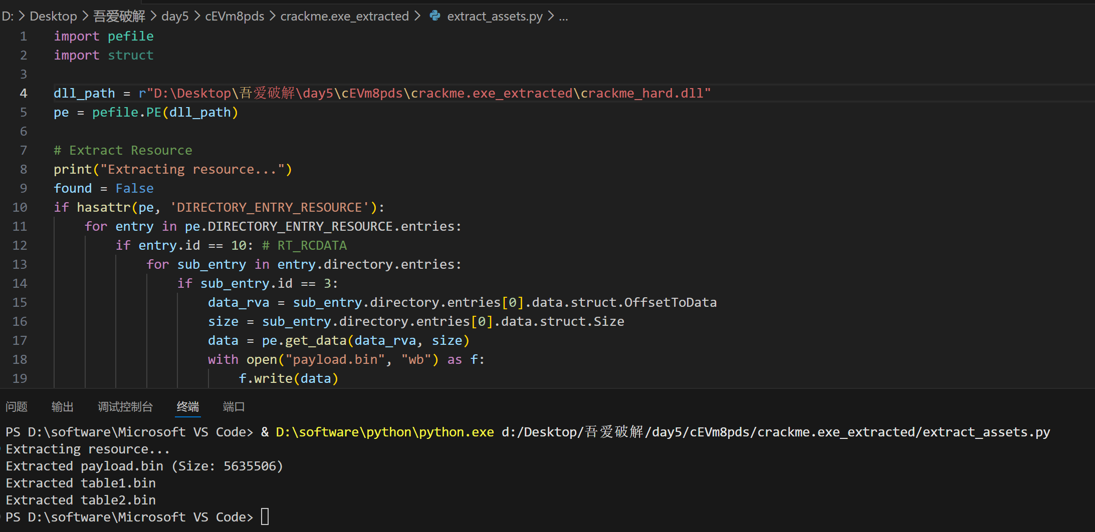 1 2 3 4 5 6 7 8 9 10 11 12 13 14 15 16 17 18 19 20 21 22 23 24 25 26 27 28 29 30 31 32 33 34 35 36 37 38 39 40 41 42 43 44 45 46 47 48 49 import pefileimport struct dll_path = r"D:\Desktop\吾爱破解\day5\cEVm8pds\crackme.exe_extracted\crackme_hard.dll" pe = pefile.PE(dll_path)print ("Extracting resource..." ) found = False if hasattr (pe, 'DIRECTORY_ENTRY_RESOURCE' ): for entry in pe.DIRECTORY_ENTRY_RESOURCE.entries: if entry.id == 10 : for sub_entry in entry.directory.entries: if sub_entry.id == 3 : data_rva = sub_entry.directory.entries[0 ].data.struct.OffsetToData size = sub_entry.directory.entries[0 ].data.struct.Size data = pe.get_data(data_rva, size) with open ("payload.bin" , "wb" ) as f: f.write(data) print (f"Extracted payload.bin (Size: {size} )" ) found = True break if not found: print ("Resource 10/3 not found!" )try : with open (dll_path, "rb" ) as f: f.seek(0x5BF00 ) table1 = f.read(1024 ) with open ("table1.bin" , "wb" ) as t1: t1.write(table1) print ("Extracted table1.bin" ) f.seek(0x5AF00 ) table2 = f.read(4096 ) with open ("table2.bin" , "wb" ) as t2: t2.write(table2) print ("Extracted table2.bin" )except Exception as e: print (f"Error extracting tables: {e} " )