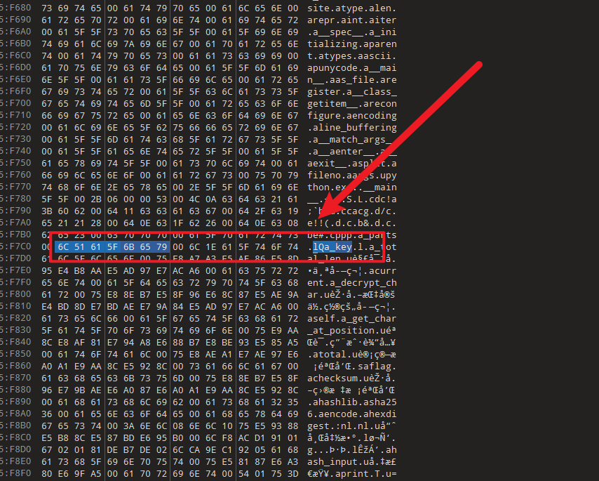 通过分析 pyc 文件的二进制内容,找到以下关键字符串: