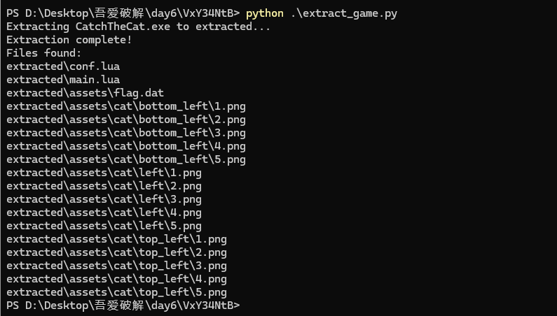 Day6 - 番外篇 初级题 一、题目分析 拿到 CatchTheCat.exe 后,首先观察程序图标和运行界面,或者通过 IDA Pro 查看字符串,可以判断这是一个使用 Love2D 游戏引擎开发的游戏。