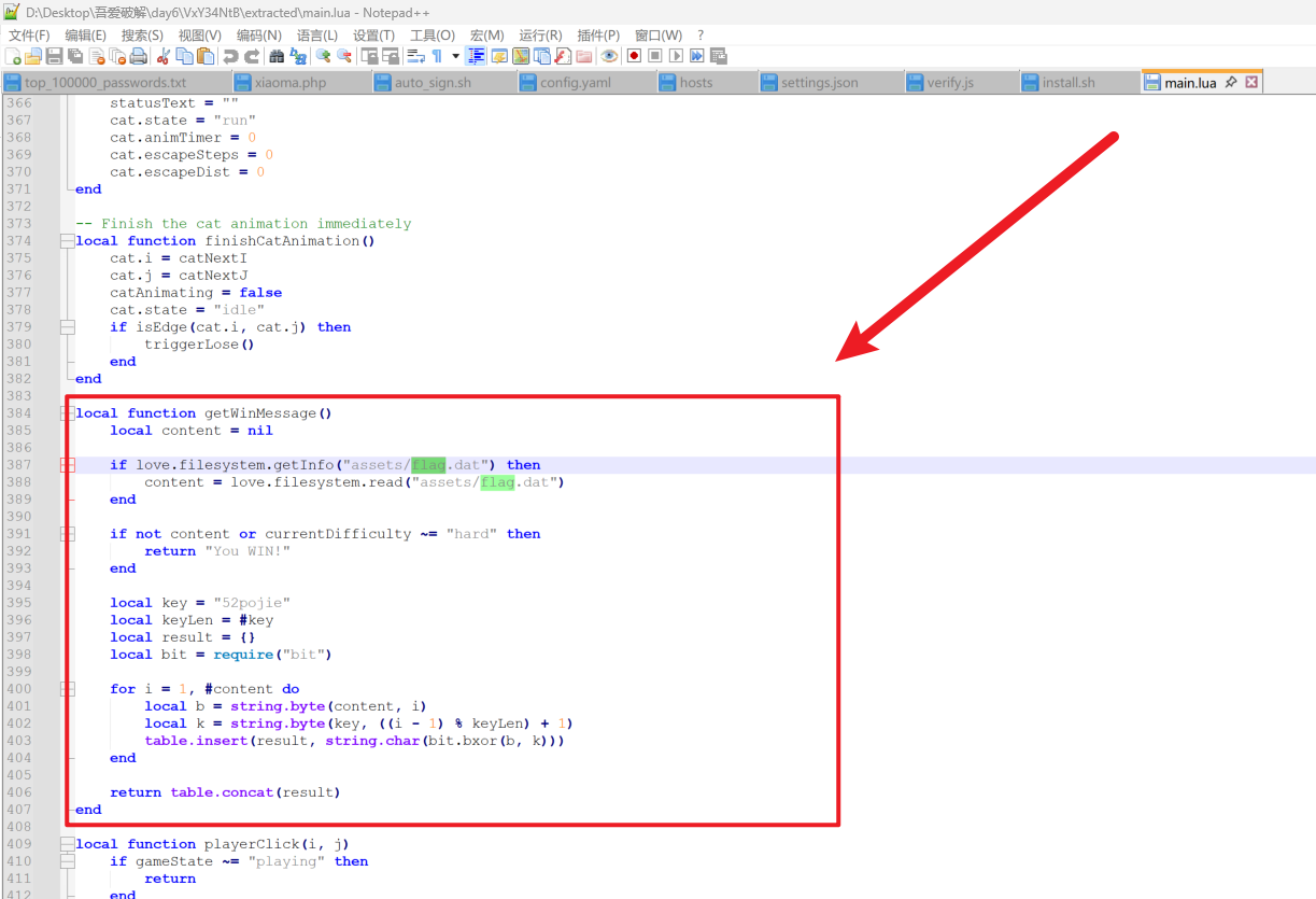 三、逻辑分析 打开 main.lua,搜索 “flag” 或 “win” 相关的逻辑,找到了 getWinMessage 函数: